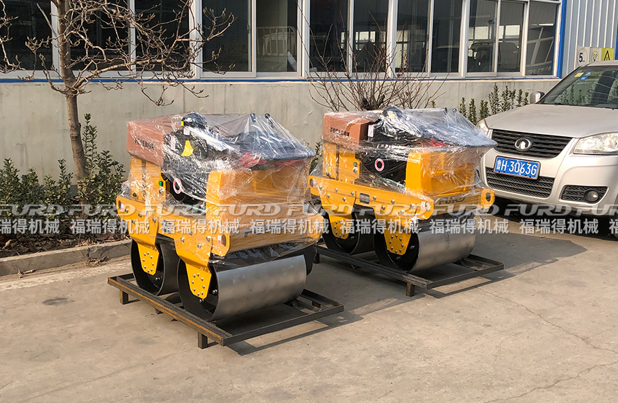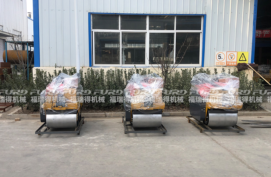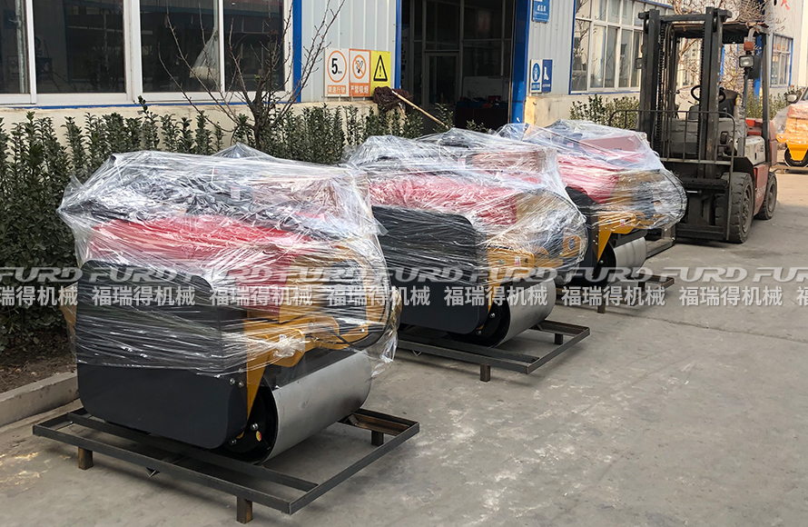 福瑞得機(jī)械5臺(tái)手扶雙輪壓路機(jī)打包裝箱出口南非